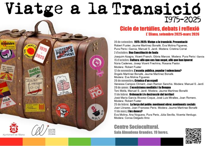 El Centre d’Estudis Locals (CEL) en col·laboració amb l’Ajuntament de l’Eliana, a través de la seua àrea de Cultura, ha organitzat el cicle ‘1975-2025: Viatge a la Transició’, una sèrie de tertúlies i debats que se celebraran entre setembre de 2025 i març de 2026 en el Centre Sociocultural, Sala Almudena Grandes, sempre a les 19.00 hores.