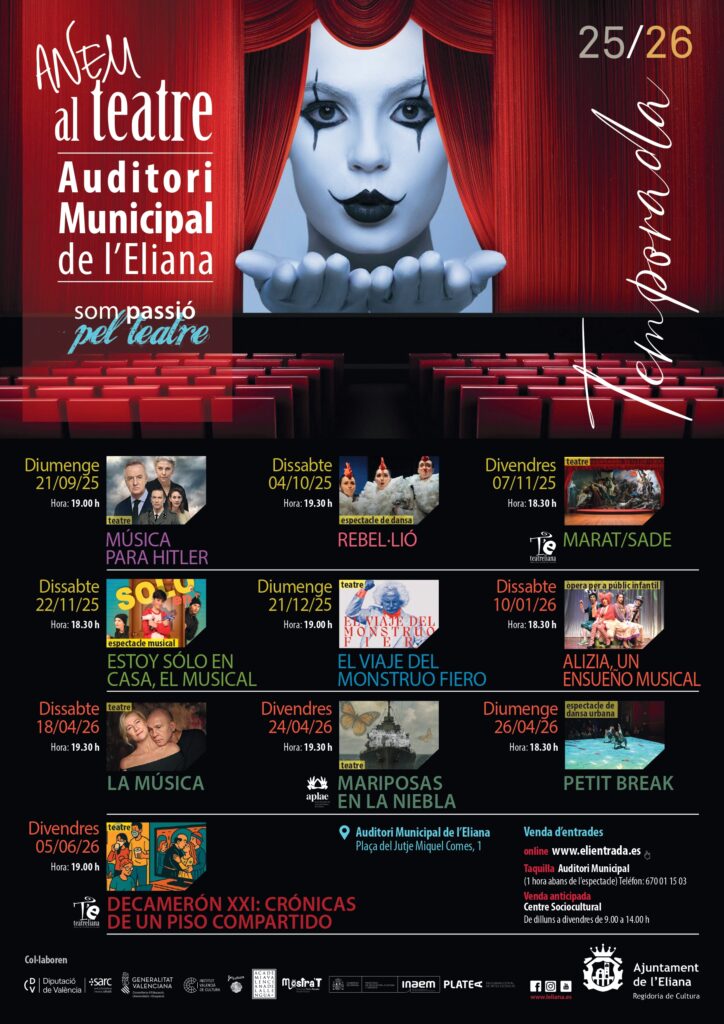 L’Ajuntament de l’Eliana ha presentat la nova programació d’Anem al Teatre 2025/2026, una acurada selecció de propostes escèniques per a continuar consolidant el municipi com a referent cultural. Una edició que combina la presència de grans noms de l’escena nacional inclosos en el programa PLATEA, el suport a les produccions valencianes, espectacles familiars, musicals i de dansa, així com les creacions de les associacions locals Teatreliana i Aplae.