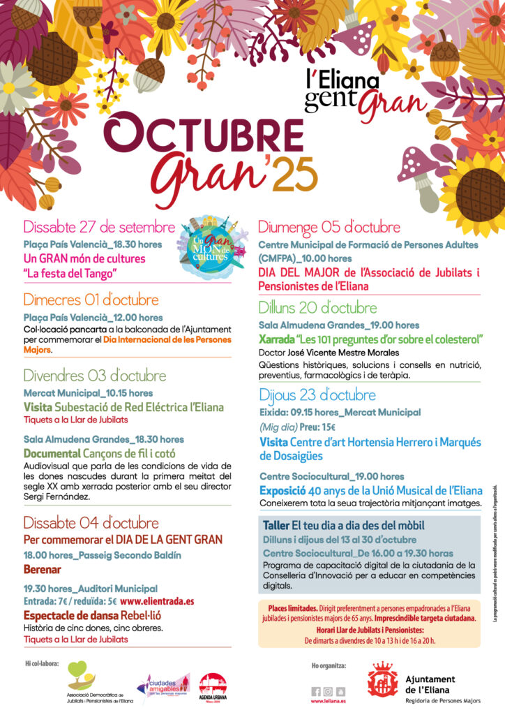 L’Eliana commemora el Dia Internacional de la Gent Gran 2025. El programa especial d’activitats s’estendrà durant tot el mes. Amb motiu de l’1 d’octubre, Dia Internacional de les Persones Majors, l’Ajuntament de l’Eliana ha preparat un programa d’actes i activitats culturals, socials i formatives que es desenvoluparan al llarg del mes, en col·laboració amb associacions locals i entitats socials.